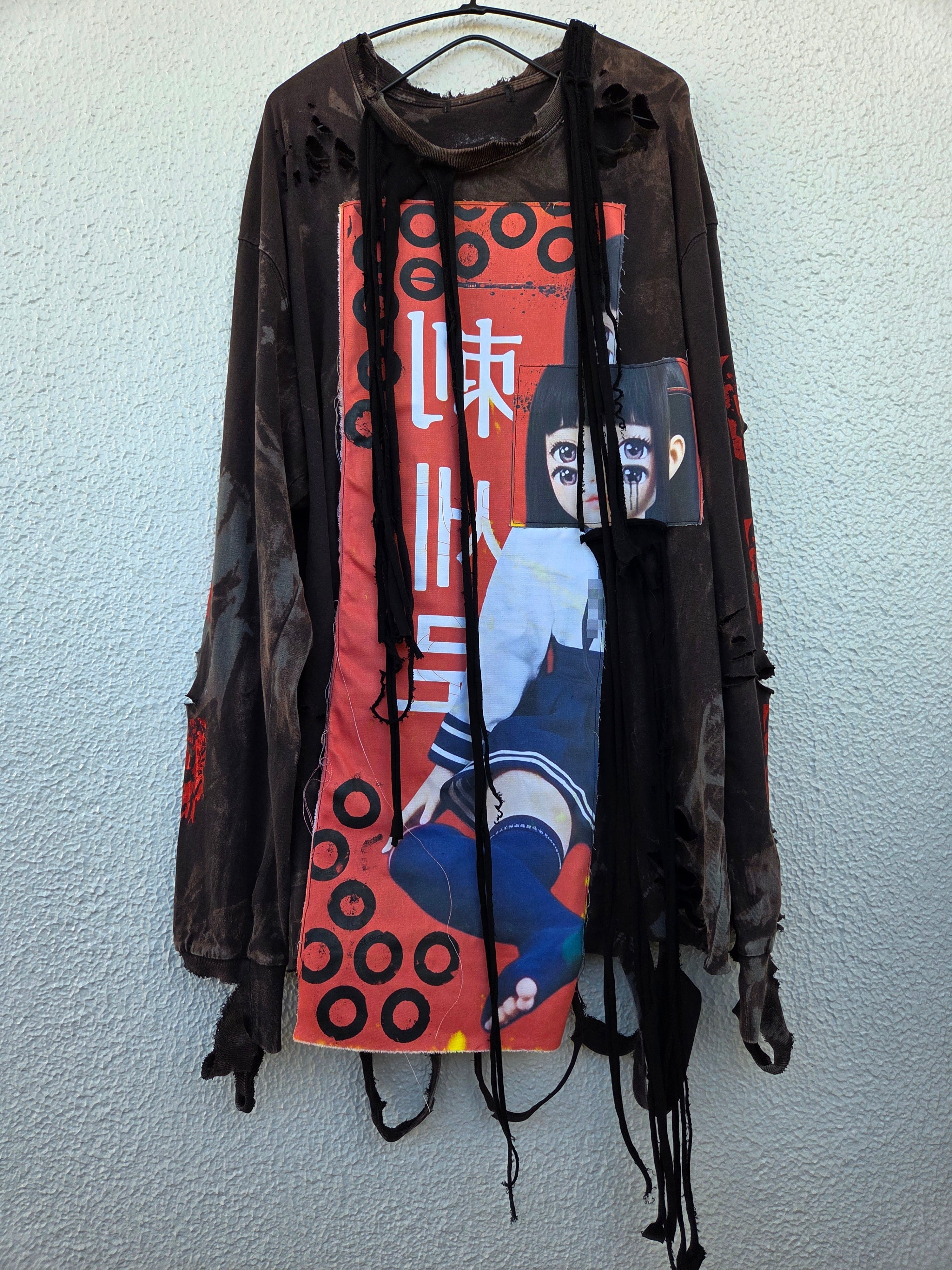 Hard customization is created by adding distressing to hoodies and sewing on fire patterns.