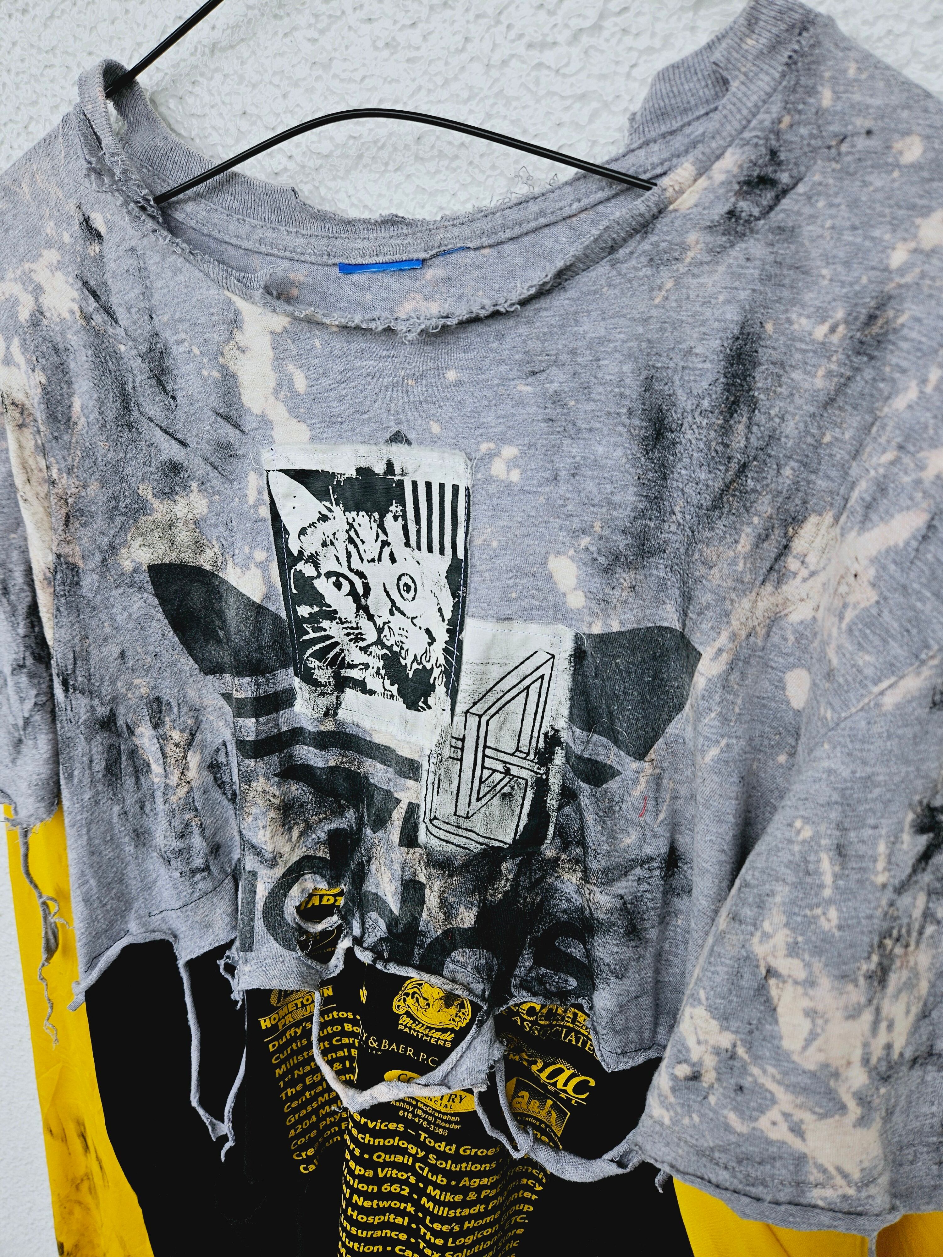 Tシャツ、ロンTをそれぞれ解体、ファイヤーパターンを縫い付ける等多めの工程を得てハードなカスタムを製作しています。重ね着しているようなロングスリーブシャツです。