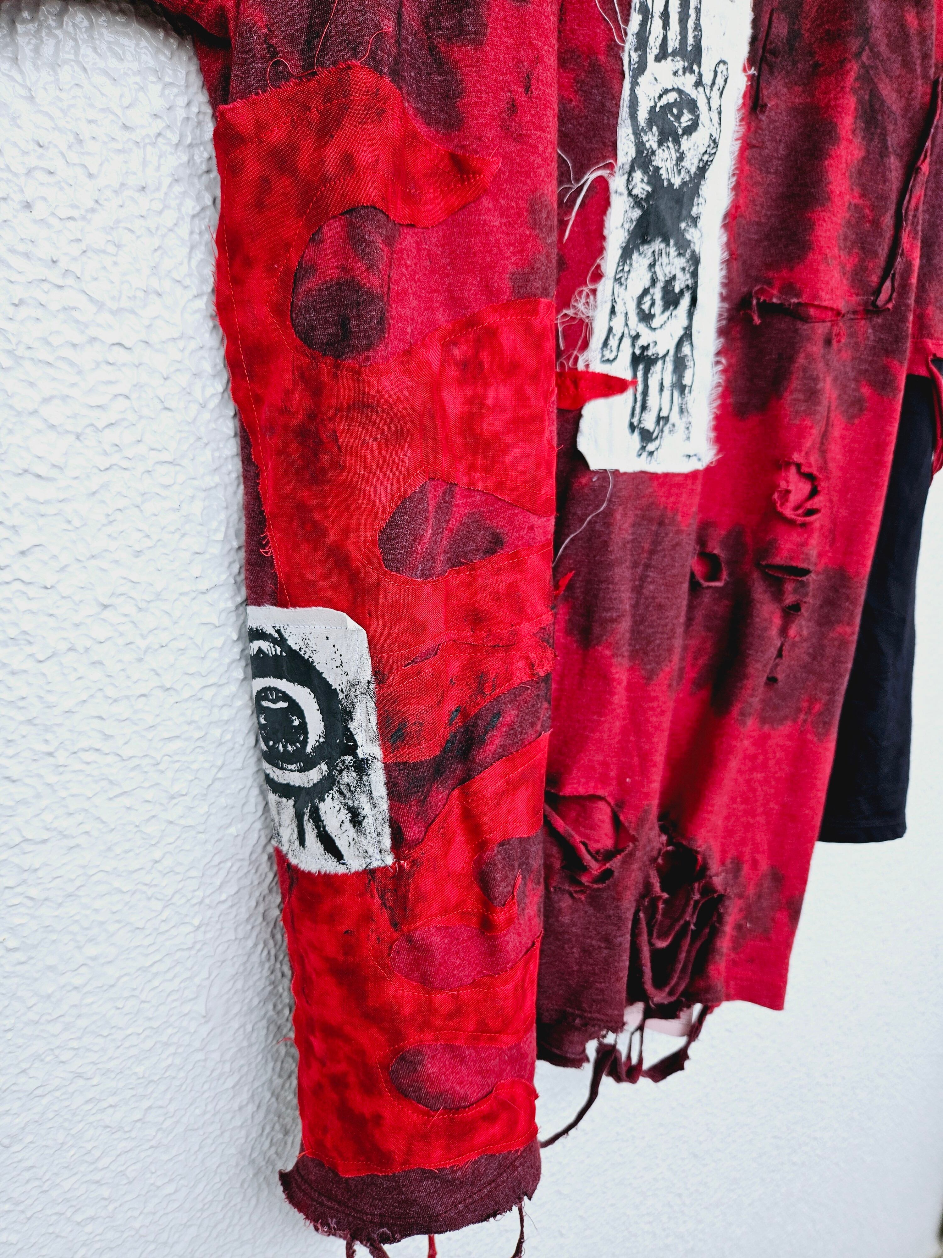 Tシャツ、ロンTをそれぞれ解体、ファイヤーパターンを縫い付ける等多めの工程を得てハードなカスタムを製作しています。重ね着しているようなロングスリーブシャツです。