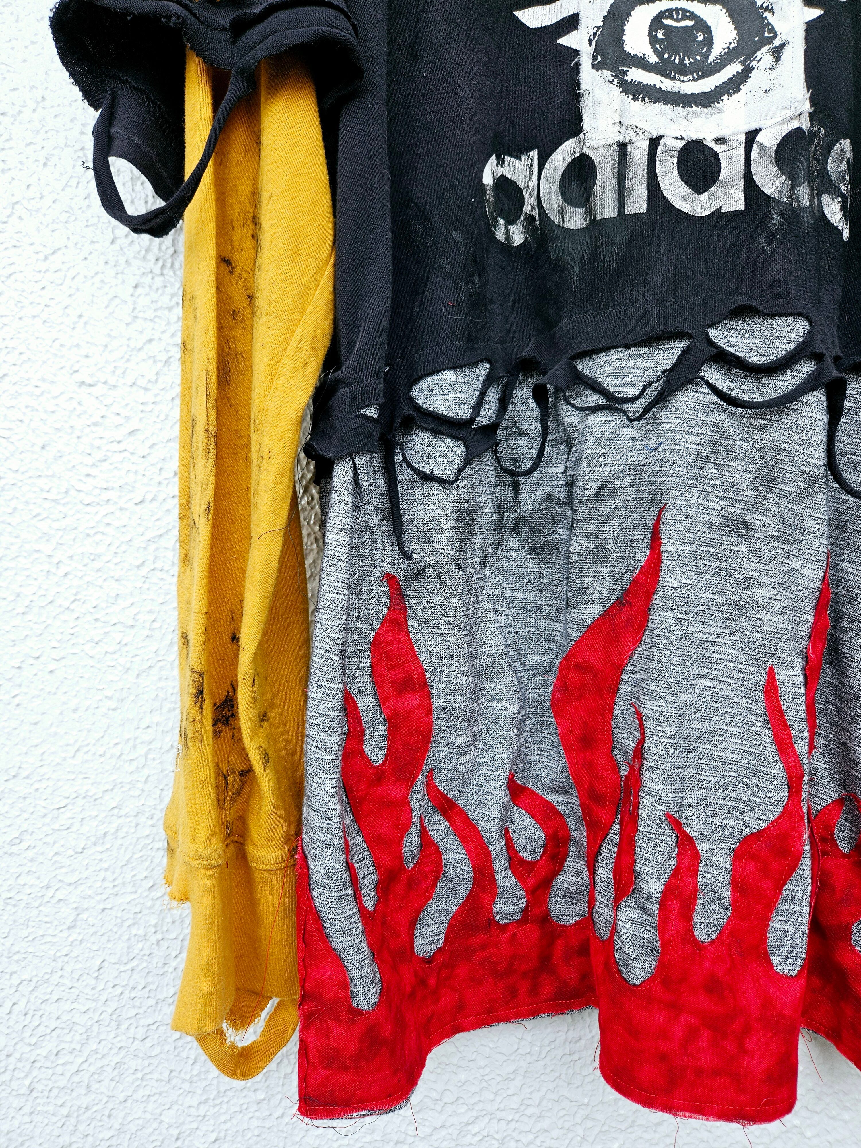 Tシャツ、ロンTをそれぞれ解体、ファイヤーパターンを縫い付ける等多めの工程を得てハードなカスタムを製作しています。重ね着しているようなロングスリーブシャツです。