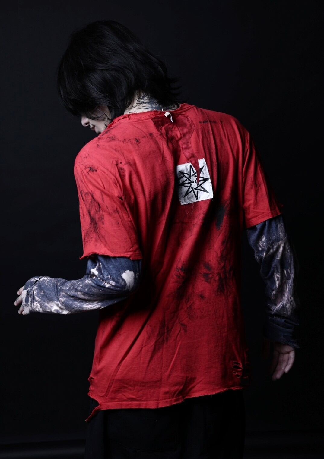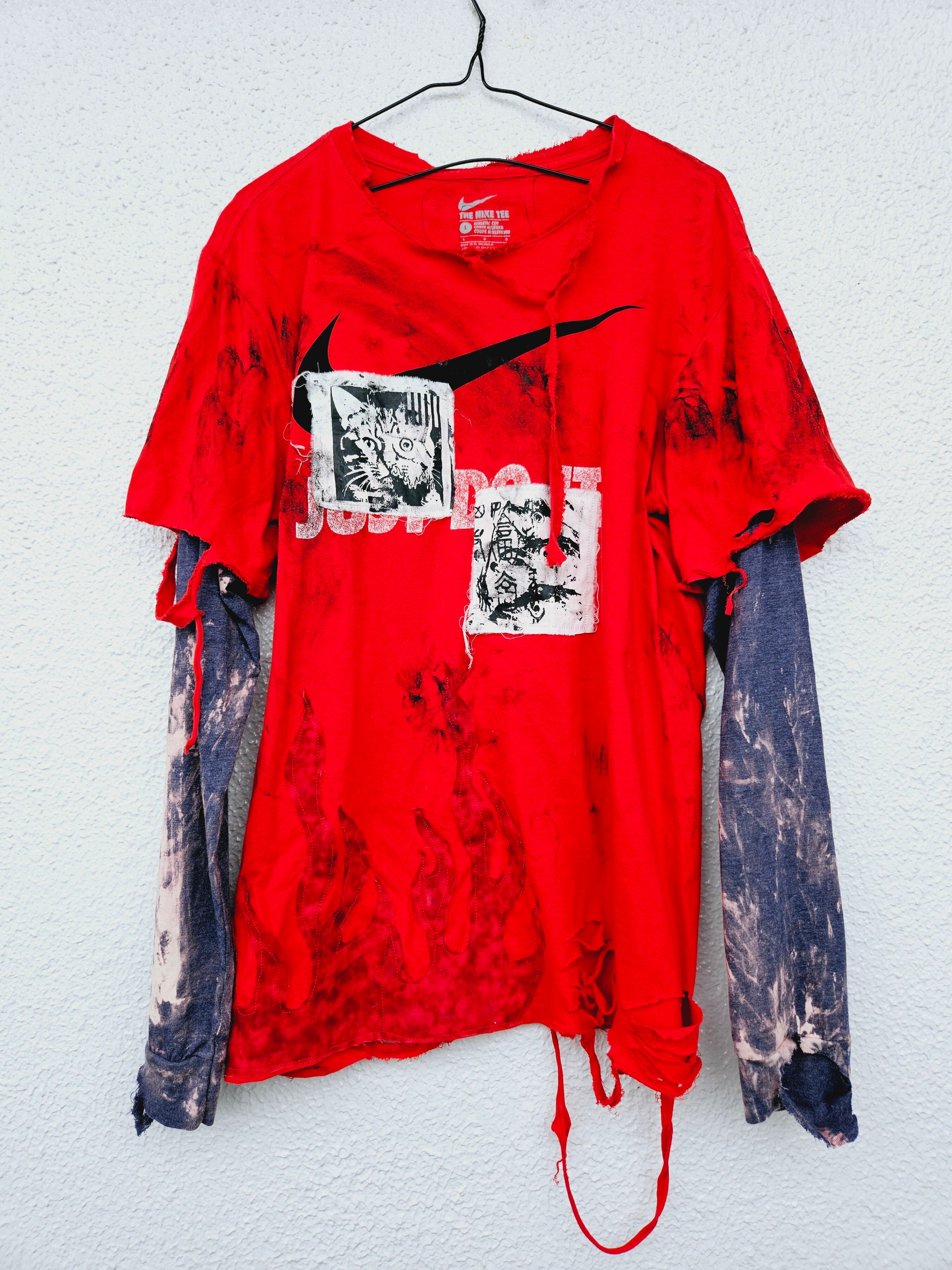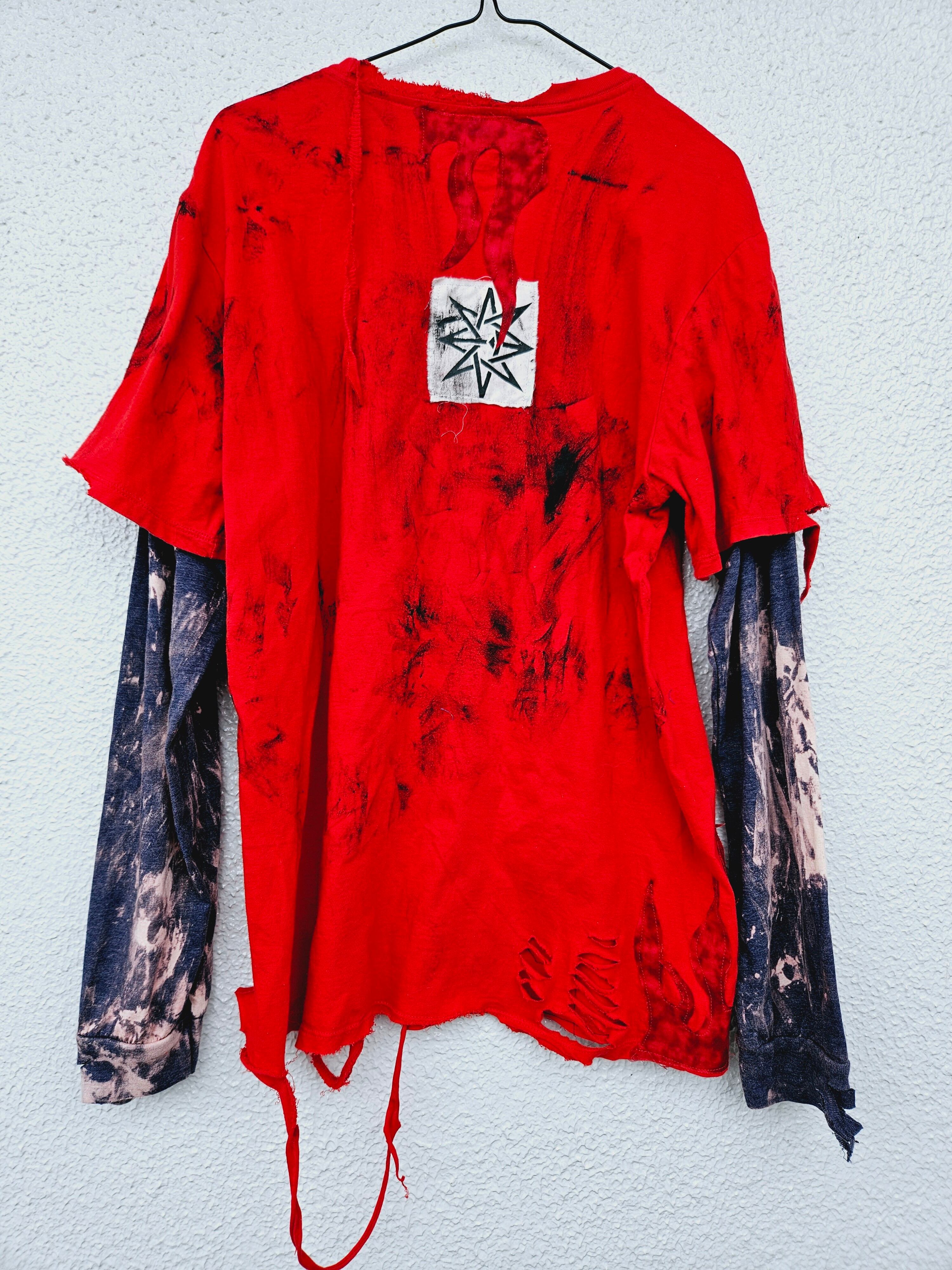 Tシャツ、ロンTをそれぞれ解体、ファイヤーパターンを縫い付ける等多めの工程を得てハードなカスタムを製作しています。重ね着しているようなロングスリーブシャツです。