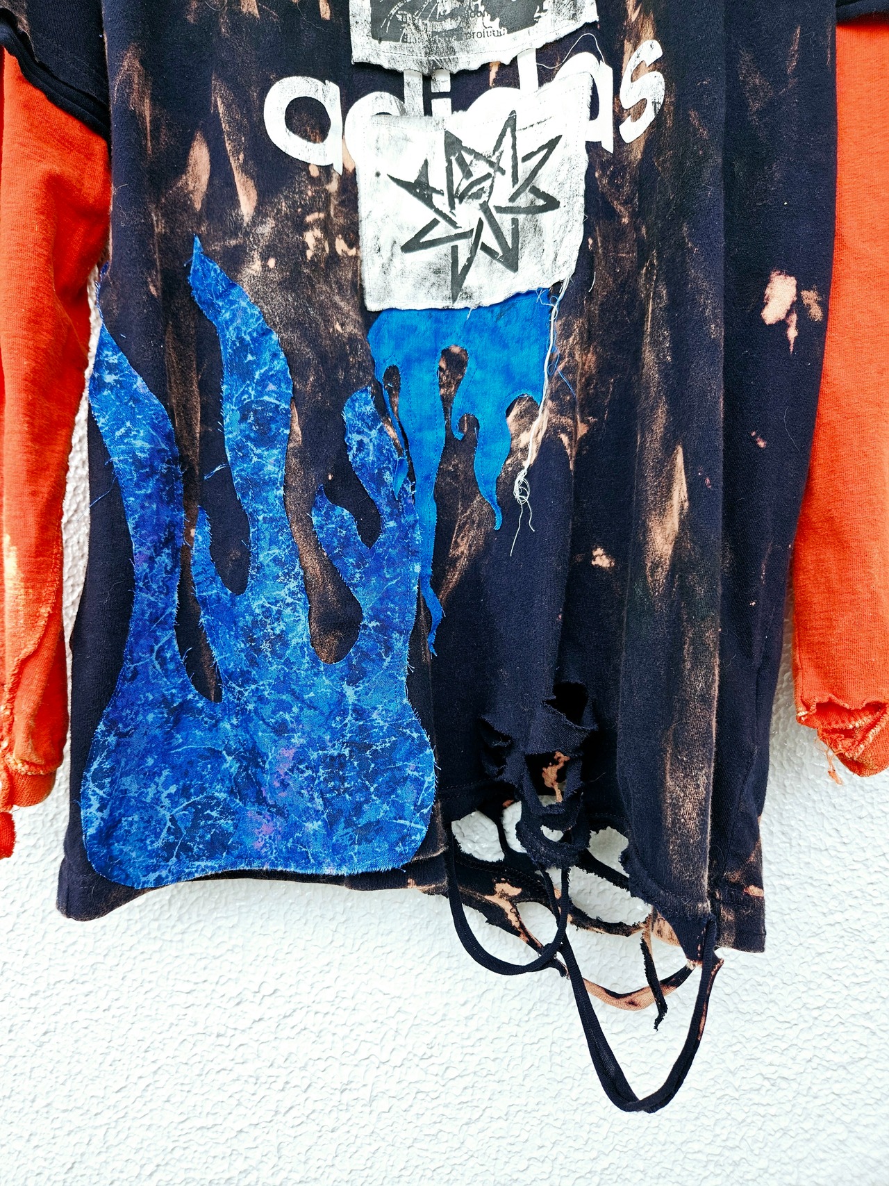 Tシャツ、ロンTをそれぞれ解体、ファイヤーパターンを縫い付ける等多めの工程を得てハードなカスタムを製作しています。重ね着しているようなロングスリーブシャツです。
