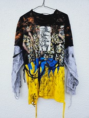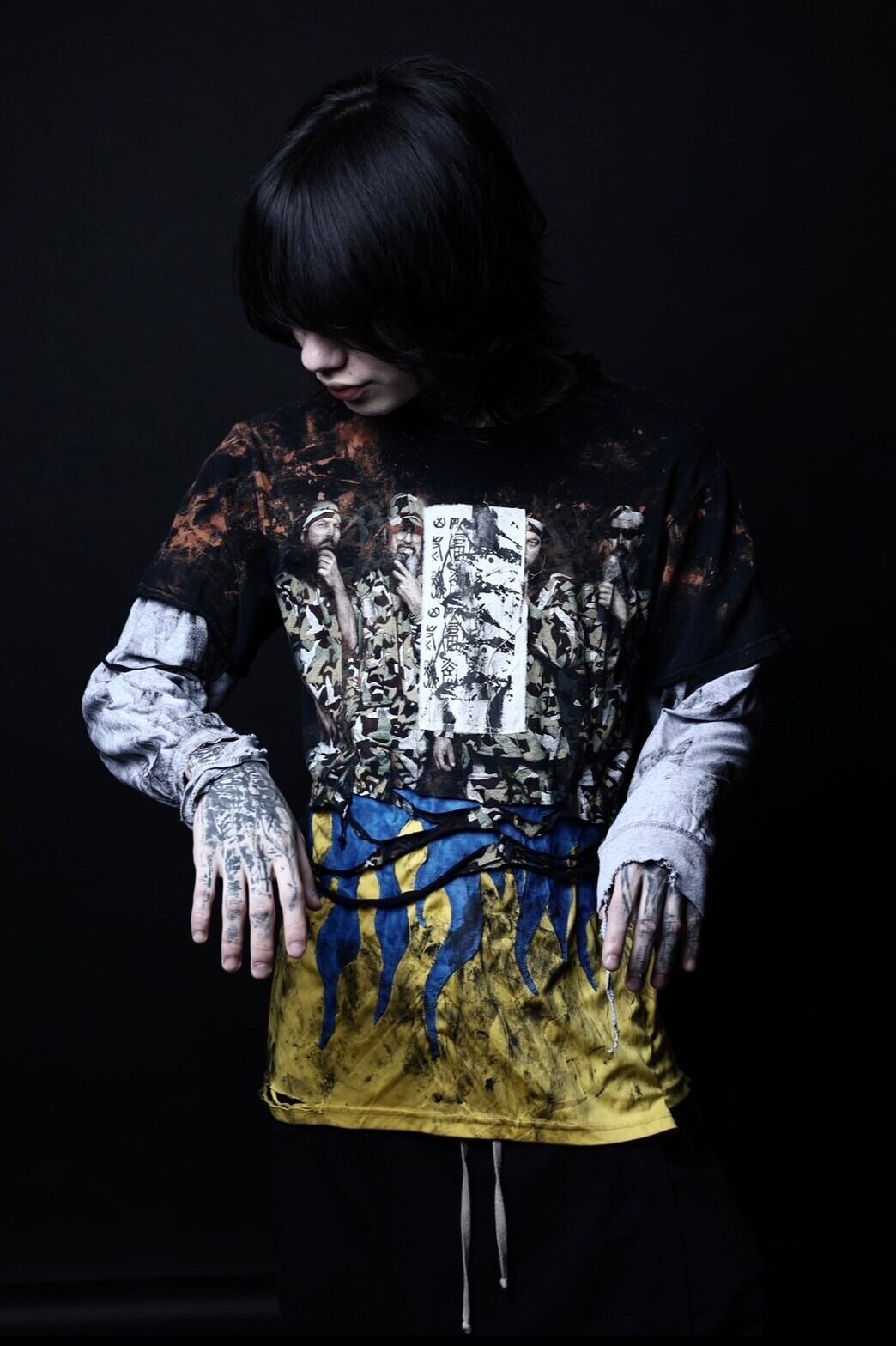 Tシャツ、ロンTをそれぞれ解体、ファイヤーパターンを縫い付ける等多めの工程を得てハードなカスタムを製作しています。重ね着しているようなロングスリーブシャツです。