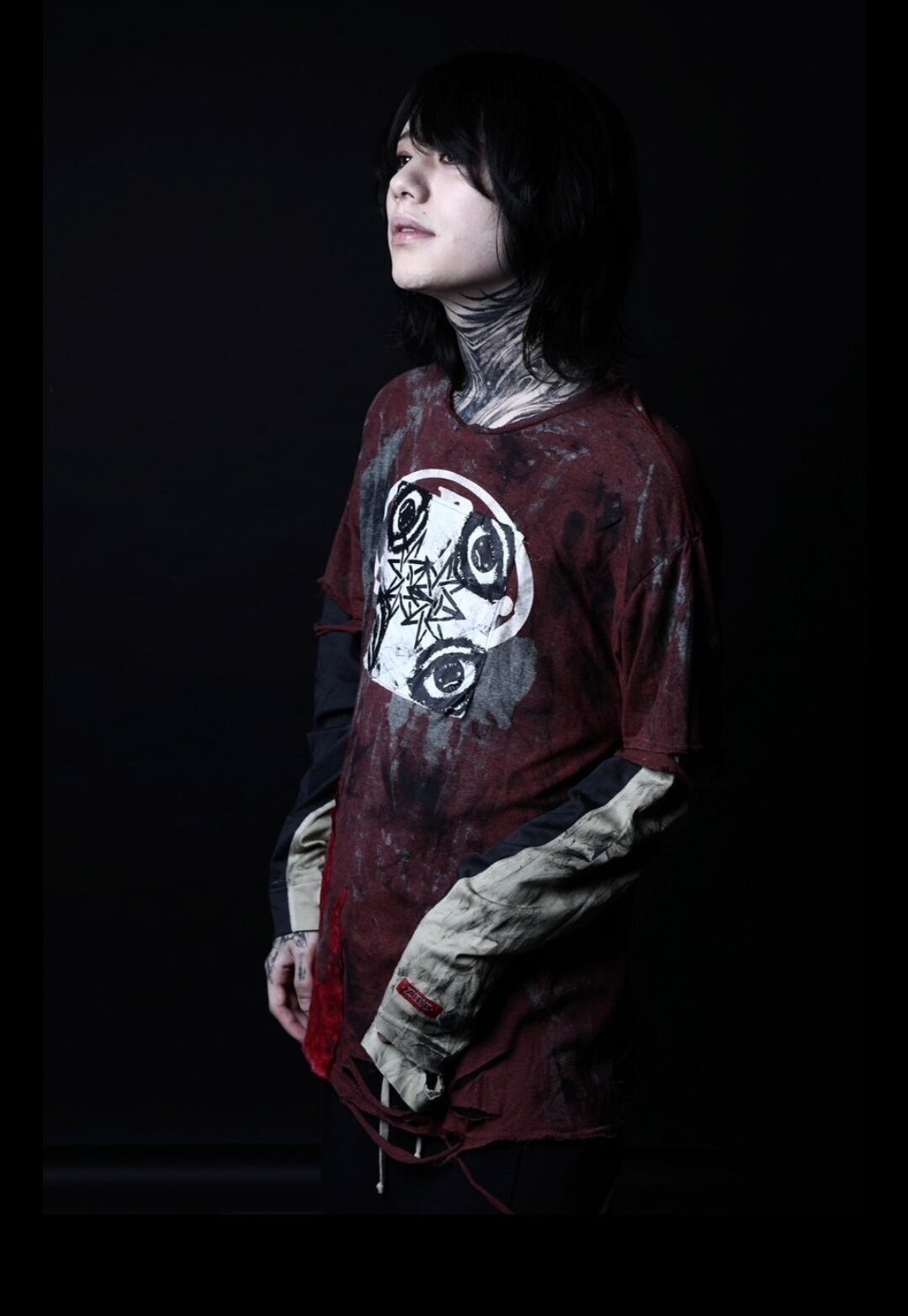 Tシャツ、ロンTをそれぞれ解体、ファイヤーパターンを縫い付ける等多めの工程を得てハードなカスタムを製作しています。重ね着しているようなロングスリーブシャツです。