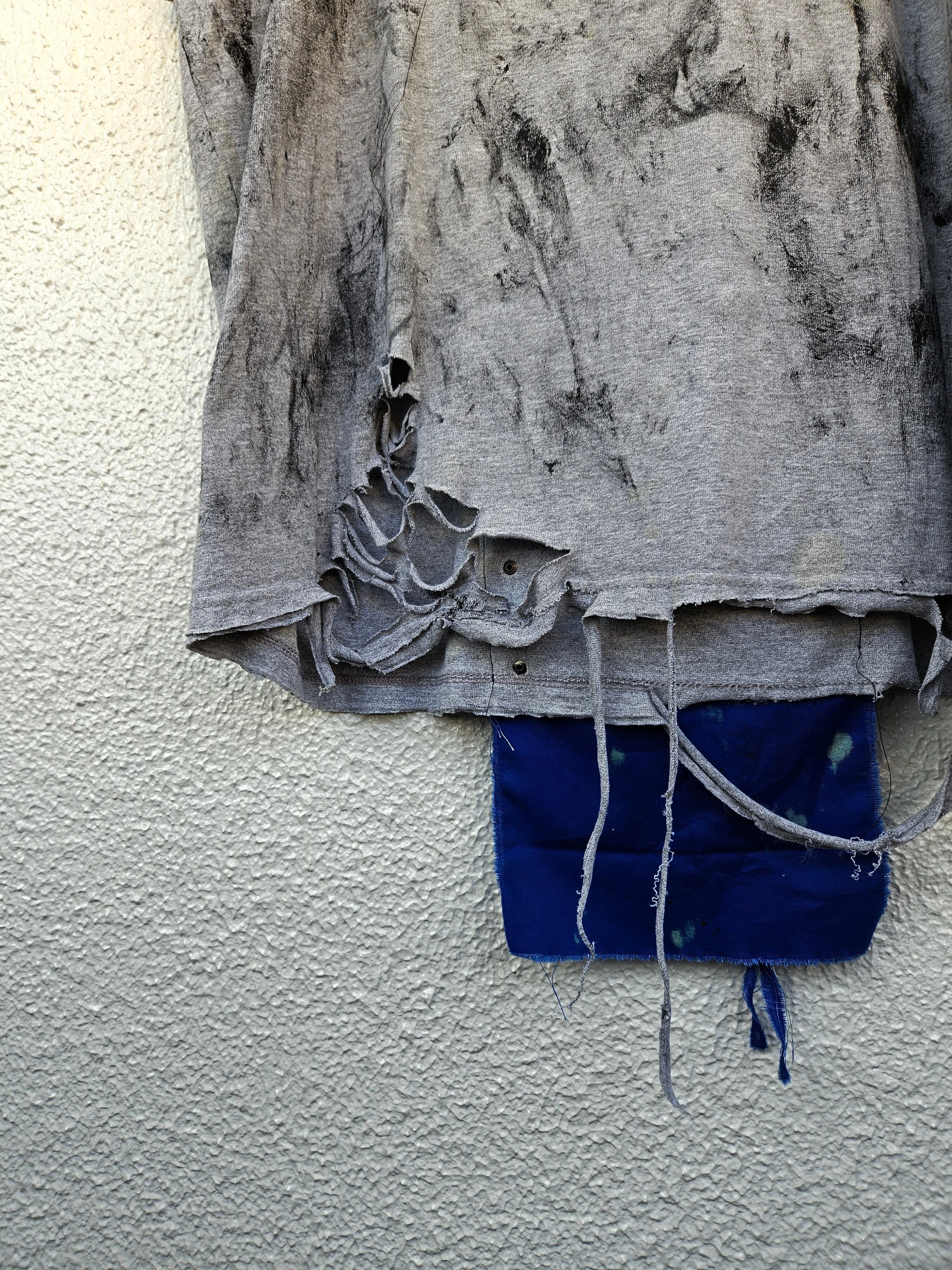 I painstakingly sew it, burn it, tear it, and make it dirty.